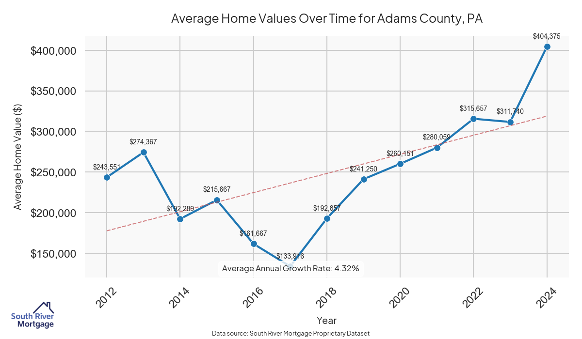 In 2024, there were 95 active reverse mortgage loans in Adams County, Pennsylvania. The average home value in Adams County is $360,523.38.