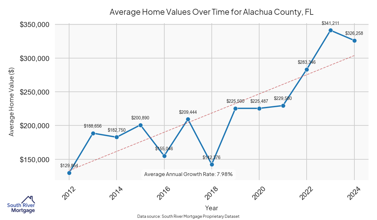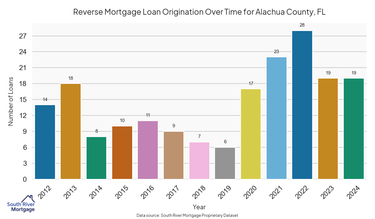 In 2024, there were 187 active reverse mortgage loans in Alachua County, Florida. The average home value in Alachua County is $341,875.65.