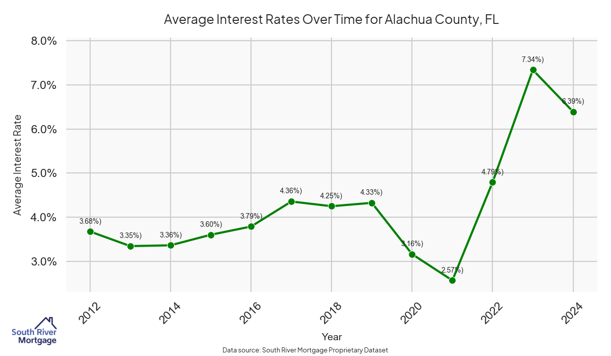 There are approximately 187 active reverse mortgage loans in Alachua County. The average interest rate in Alachua County is 7.0% for reverse mortgages. The average maximum claim amount (the lesser of the appraisal or lending limit), among reverse mortgage borrowers, in Alachua County was $359,782.61 in 2024.