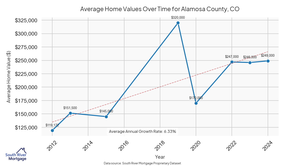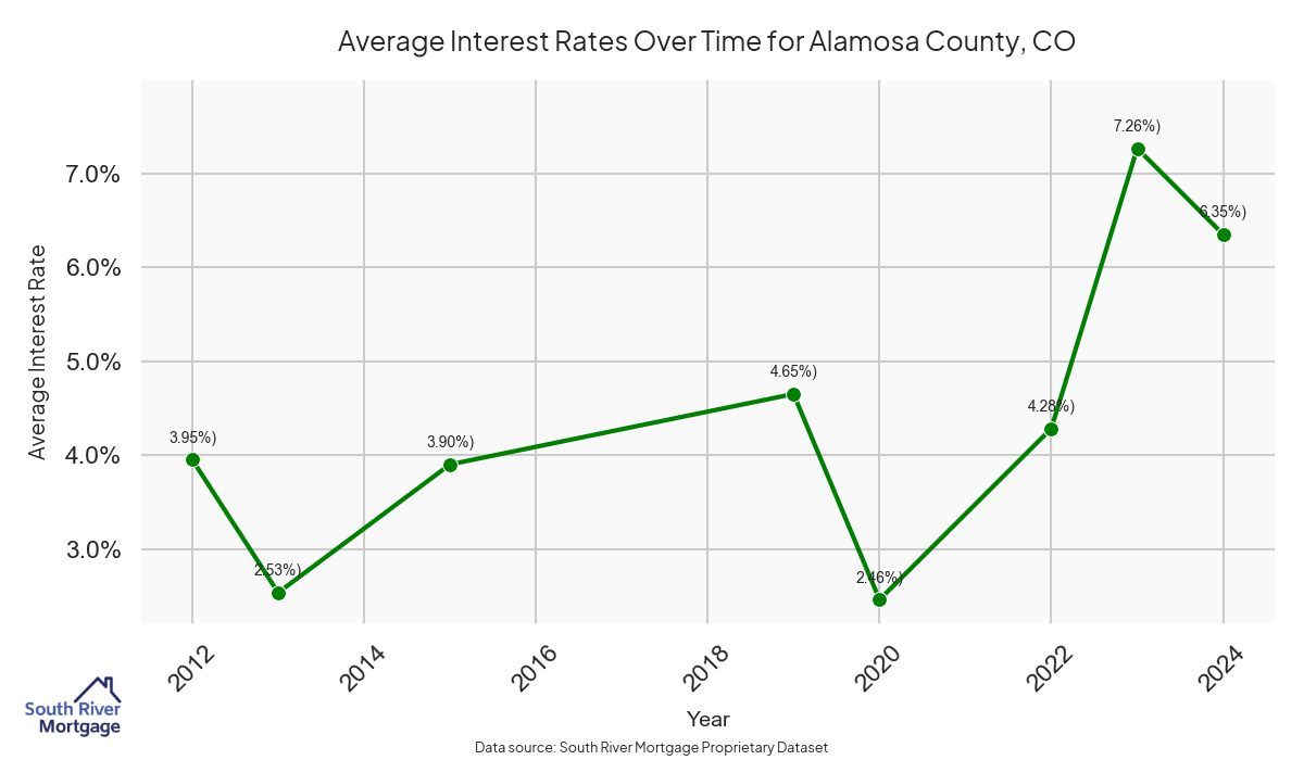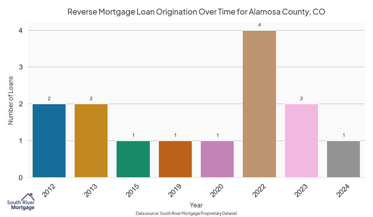 There are approximately 14 active reverse mortgage loans in Alamosa County. The average interest rate in Alamosa County is 7.27% for reverse mortgages. The average maximum claim amount (the lesser of the appraisal or lending limit), among reverse mortgage borrowers, in Alamosa County was $250,000.00 in 2024.
