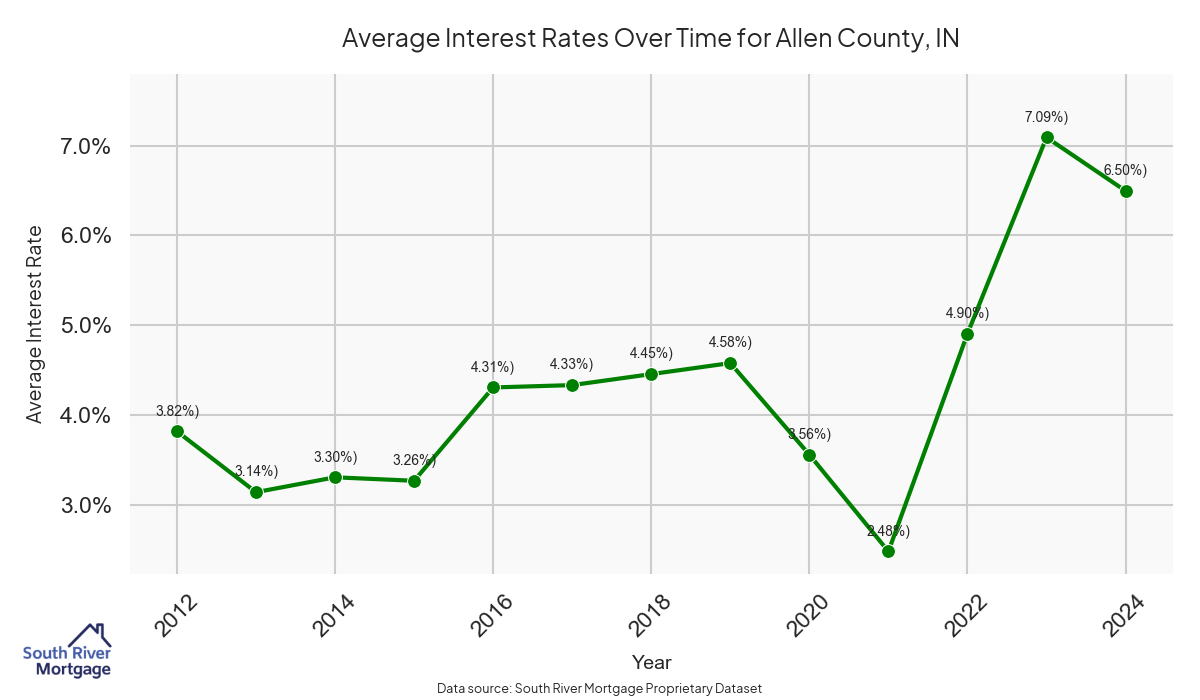 There are approximately 152 active reverse mortgage loans in Allen County. The average interest rate in Allen County is 7.64% for reverse mortgages. The average maximum claim amount (the lesser of the appraisal or lending limit), among reverse mortgage borrowers, in Allen County was $255,476.19 in 2024.
