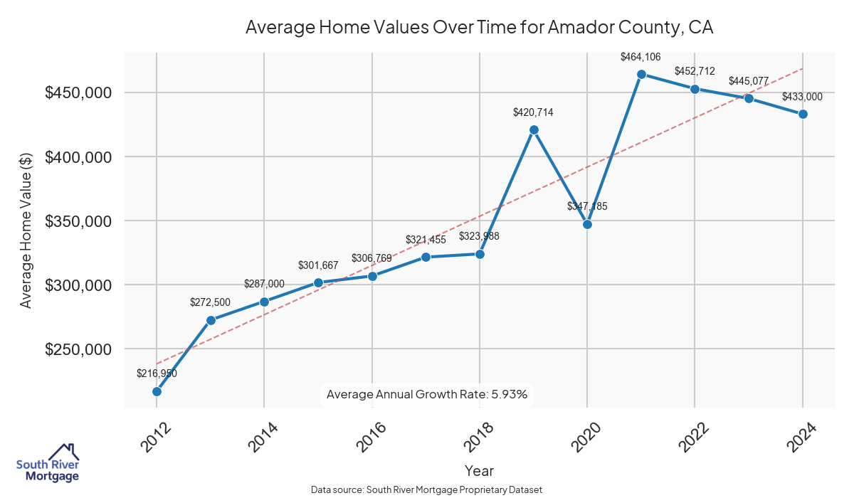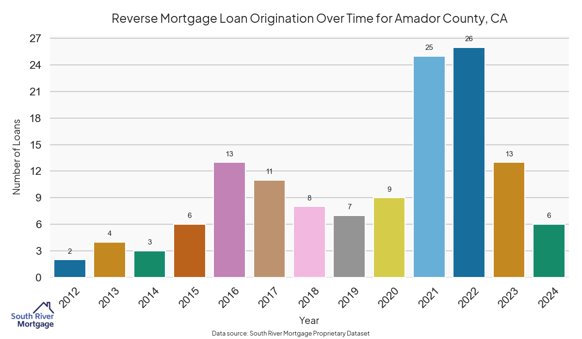In 2024, there were 129 active reverse mortgage loans in Amador County, California. The average home value in Amador County is $453,700.92.