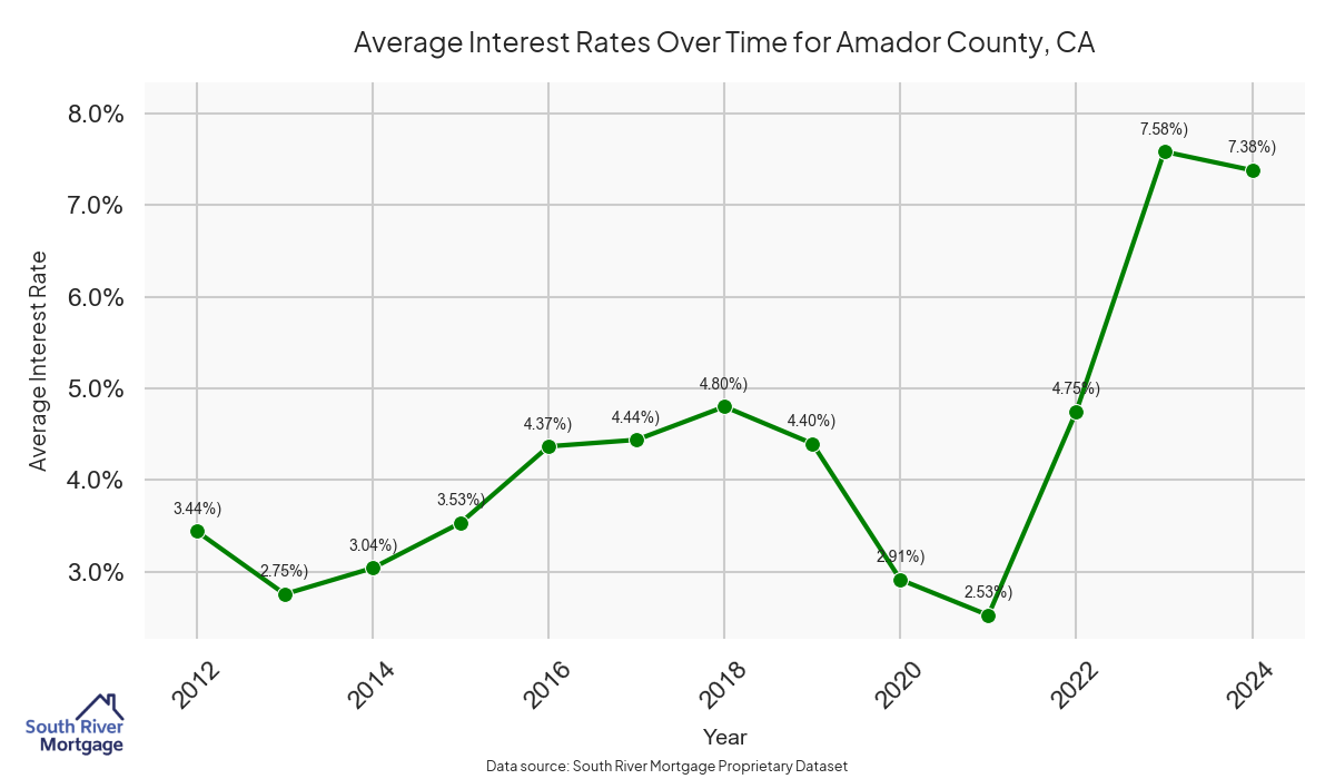 There are approximately 129 active reverse mortgage loans in Amador County. The average interest rate in Amador County is 7.5% for reverse mortgages. The average maximum claim amount (the lesser of the appraisal or lending limit), among reverse mortgage borrowers, in Amador County was $440,000.00 in 2024.
