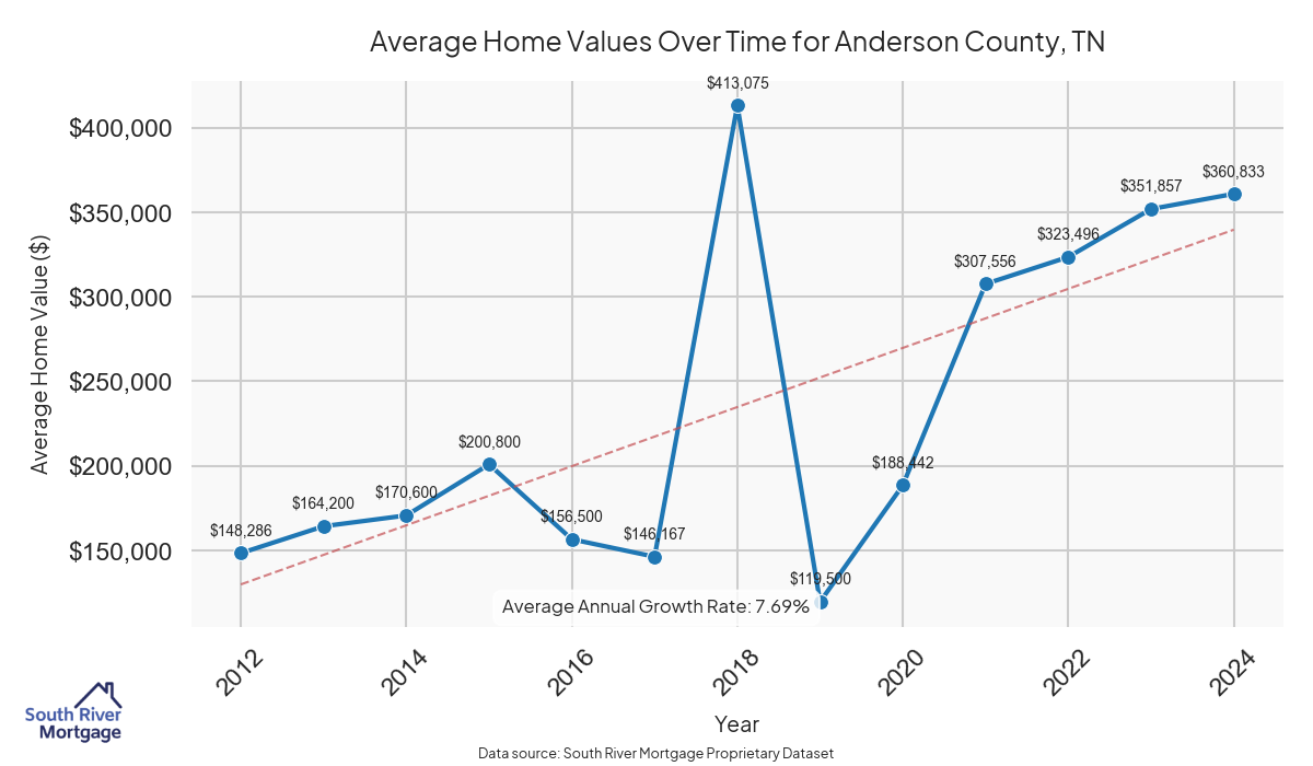 In 2024, there were 73 active reverse mortgage loans in Anderson County, Tennessee. The average home value in Anderson County is $351,188.70.