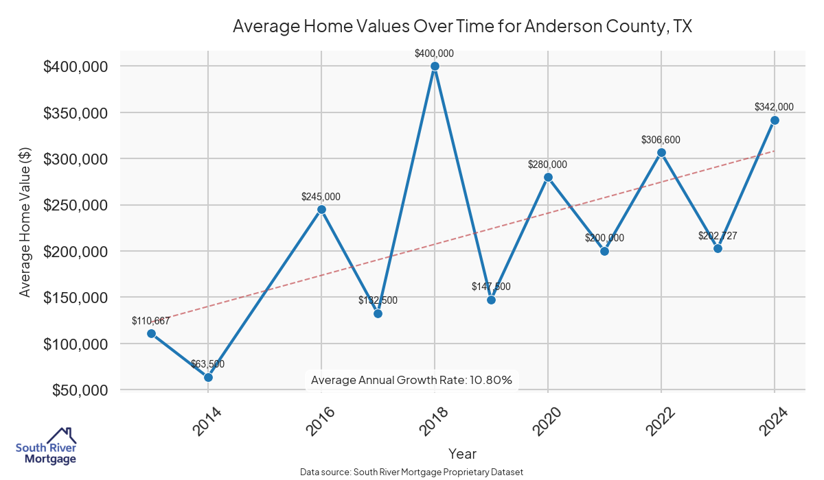 In 2024, there were 25 active reverse mortgage loans in Anderson County, Texas. The average home value in Anderson County is $290,916.96.