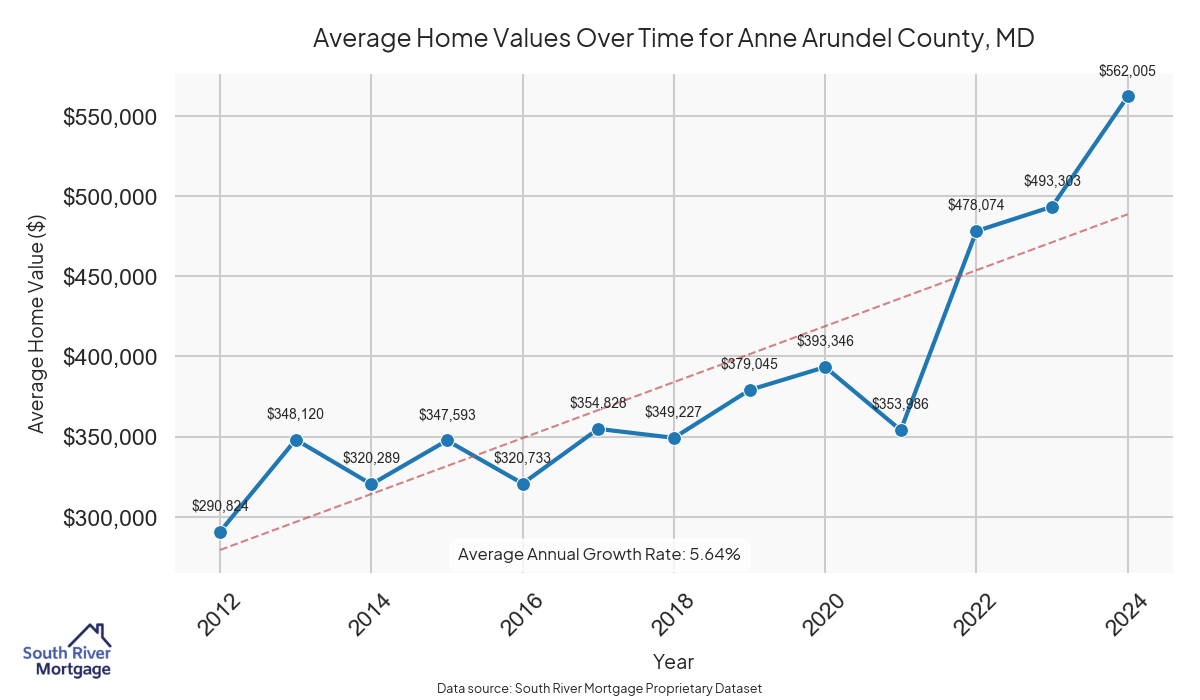 In 2024, there were 732 active reverse mortgage loans in Anne Arundel County, Maryland. The average home value in Anne Arundel County is $554,703.42.