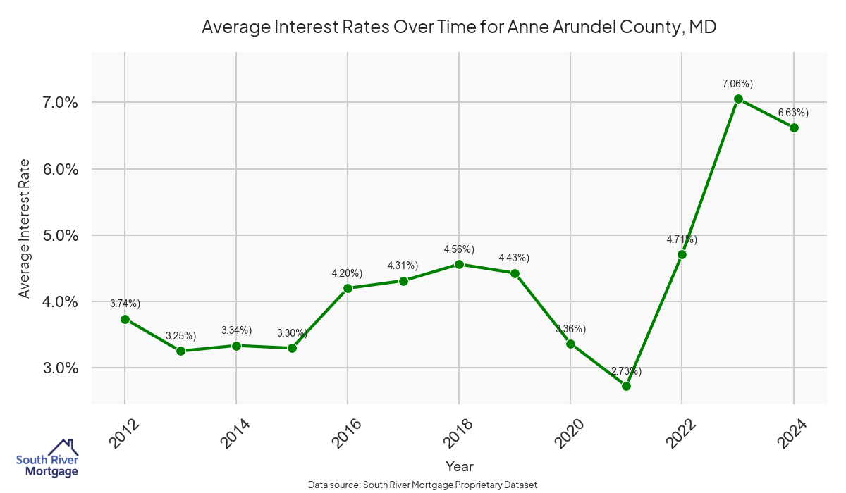 There are approximately 732 active reverse mortgage loans in Anne Arundel County. The average interest rate in Anne Arundel County is 7.36% for reverse mortgages. The average maximum claim amount (the lesser of the appraisal or lending limit), among reverse mortgage borrowers, in Anne Arundel County was $412,058.82 in 2024.