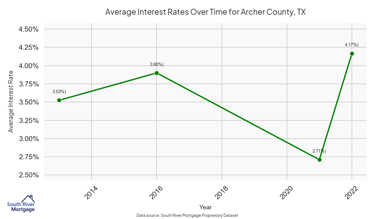There are approximately 6 active reverse mortgage loans in Archer County. The average interest rate in Archer County is 7.35% for reverse mortgages. The average maximum claim amount (the lesser of the appraisal or lending limit), among reverse mortgage borrowers, in Archer County was $365,000.00 in 2024.