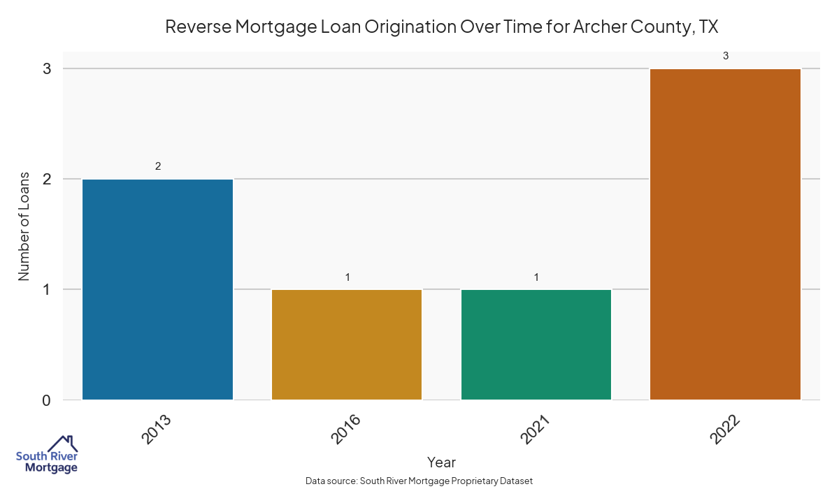 In 2024, there were 6 active reverse mortgage loans in Archer County, Texas. The average home value in Archer County is $224,903.00.