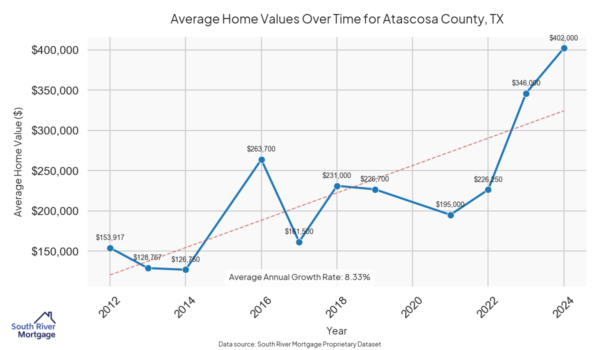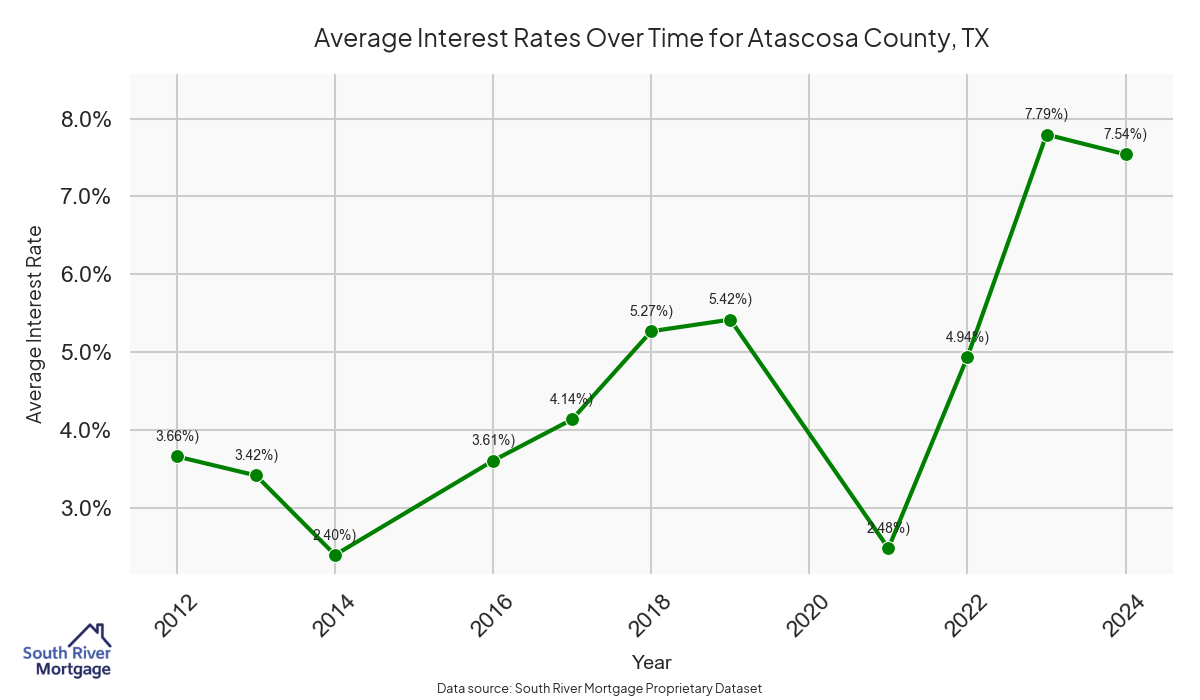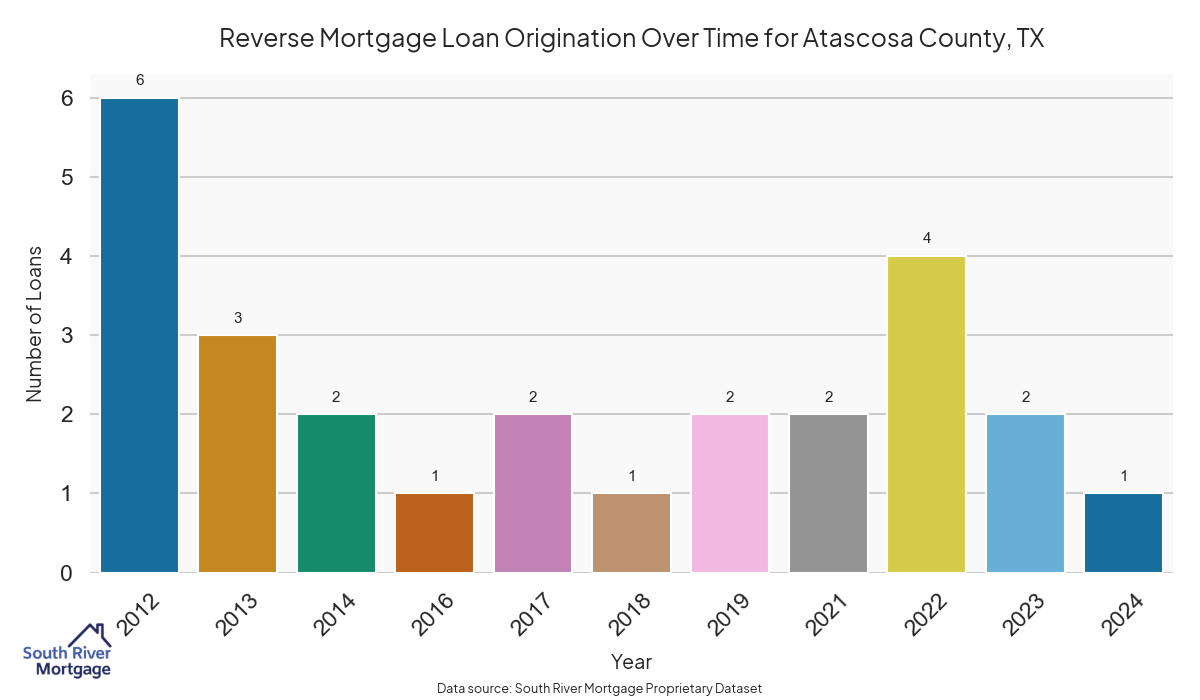There are approximately 26 active reverse mortgage loans in Atascosa County. The average interest rate in Atascosa County is 7.8% for reverse mortgages. The average maximum claim amount (the lesser of the appraisal or lending limit), among reverse mortgage borrowers, in Atascosa County was $288,333.33 in 2024.