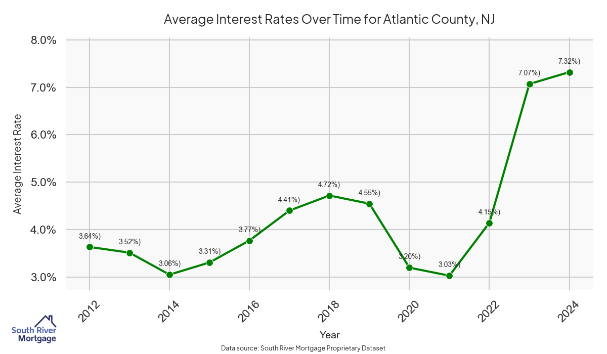 There are approximately 271 active reverse mortgage loans in Atlantic County. The average interest rate in Atlantic County is 7.86% for reverse mortgages. The average maximum claim amount (the lesser of the appraisal or lending limit), among reverse mortgage borrowers, in Atlantic County was $425,263.16 in 2024.