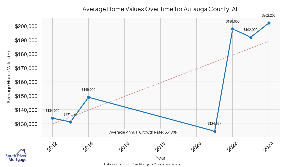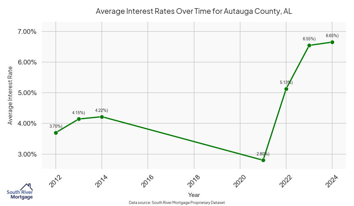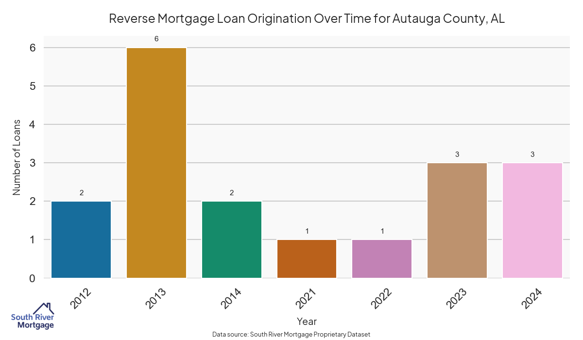 There are approximately 17 active reverse mortgage loans in Autauga County. The average interest rate in Autauga County is 7.16% for reverse mortgages. The average maximum claim amount (the lesser of the appraisal or lending limit), among reverse mortgage borrowers, in Autauga County was $210,000.00 in 2024.