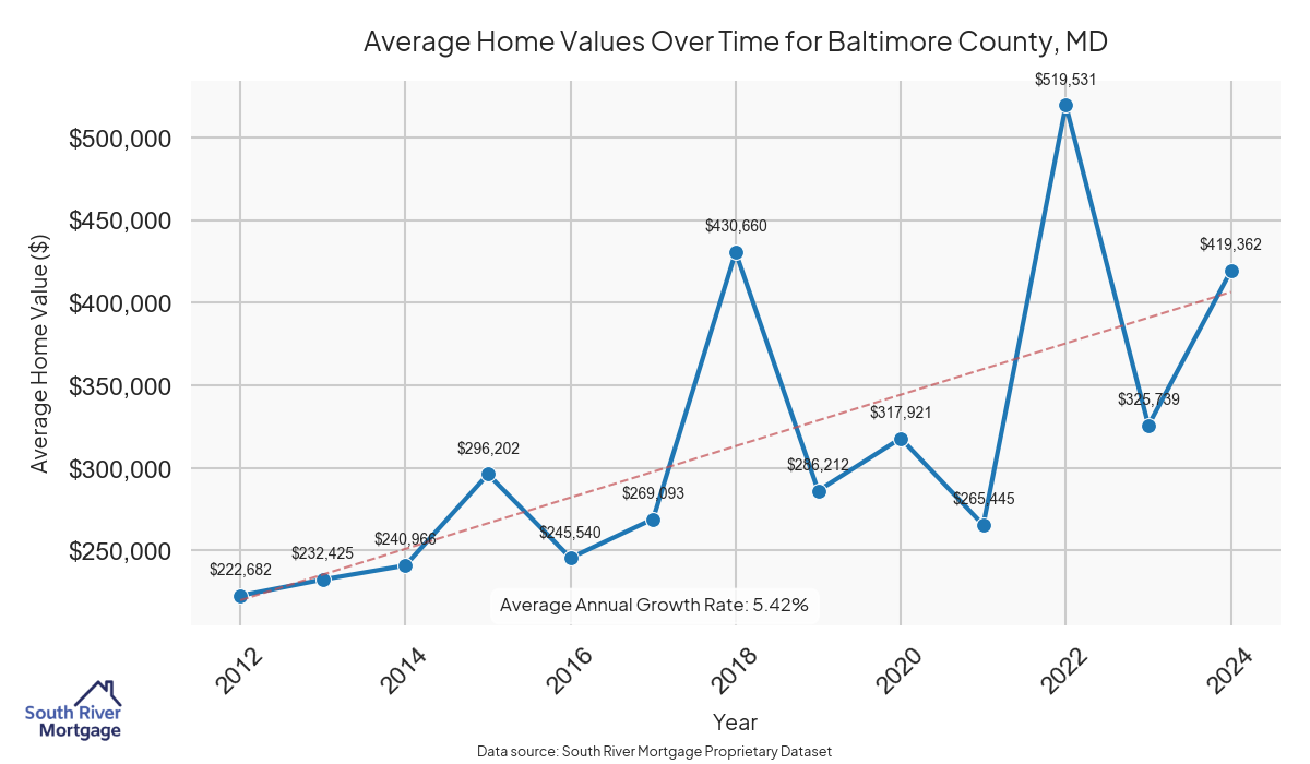 In 2024, there were 1034 active reverse mortgage loans in Baltimore County, Maryland. The average home value in Baltimore County is $400,498.78.
