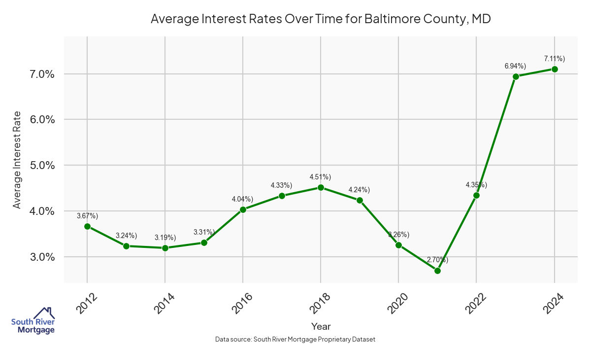 There are approximately 1034 active reverse mortgage loans in Baltimore County. The average interest rate in Baltimore County is 7.35% for reverse mortgages. The average maximum claim amount (the lesser of the appraisal or lending limit), among reverse mortgage borrowers, in Baltimore County was $397,931.03 in 2024.