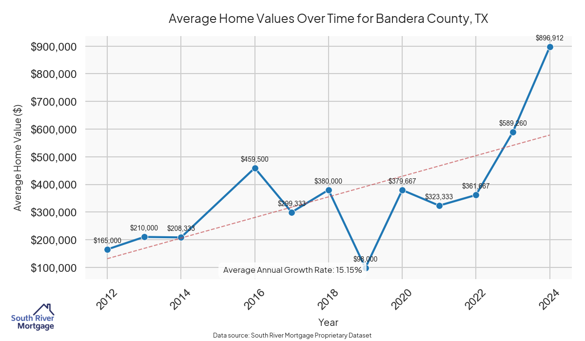 In 2024, there were 22 active reverse mortgage loans in Bandera County, Texas. The average home value in Bandera County is $408,525.77.