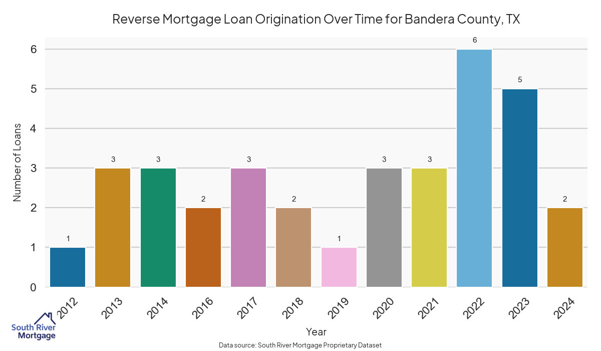 There are approximately 22 active reverse mortgage loans in Bandera County. The average interest rate in Bandera County is 7.88% for reverse mortgages. The average maximum claim amount (the lesser of the appraisal or lending limit), among reverse mortgage borrowers, in Bandera County was $710,000.00 in 2024.