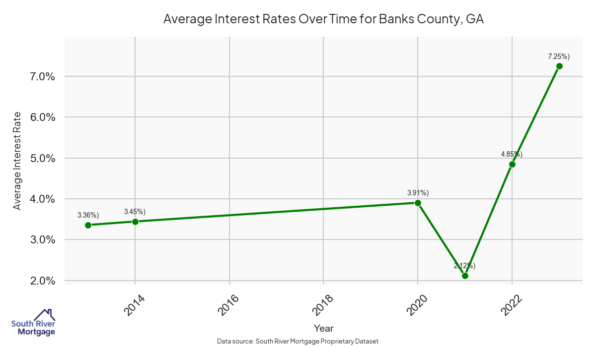There are approximately 11 active reverse mortgage loans in Banks County. The average interest rate in Banks County is 7.91% for reverse mortgages. The average maximum claim amount (the lesser of the appraisal or lending limit), among reverse mortgage borrowers, in Banks County was $385,000.00 in 2024.