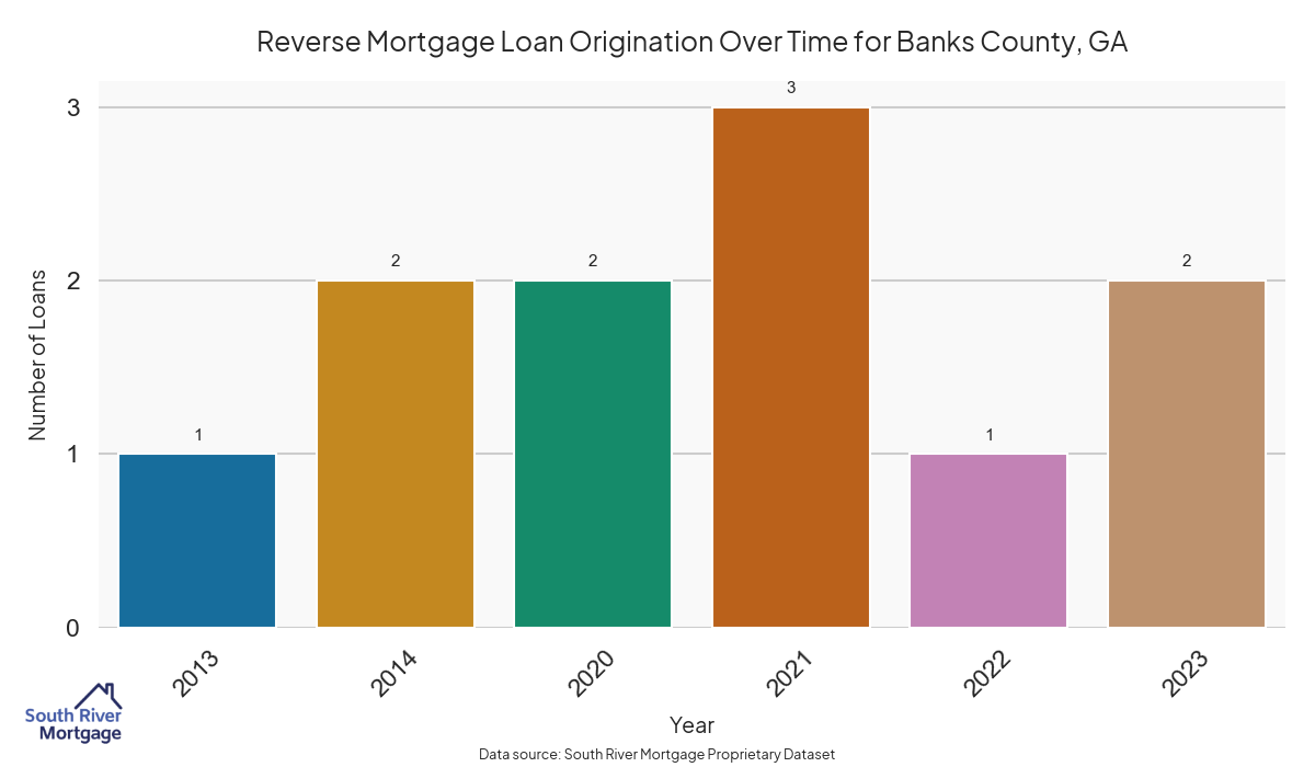 In 2024, there were 11 active reverse mortgage loans in Banks County, Georgia. The average home value in Banks County is $400,538.45.
