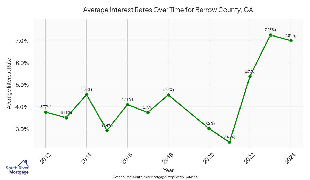 There are approximately 65 active reverse mortgage loans in Barrow County. The average interest rate in Barrow County is 7.61% for reverse mortgages. The average maximum claim amount (the lesser of the appraisal or lending limit), among reverse mortgage borrowers, in Barrow County was $492,826.09 in 2024.