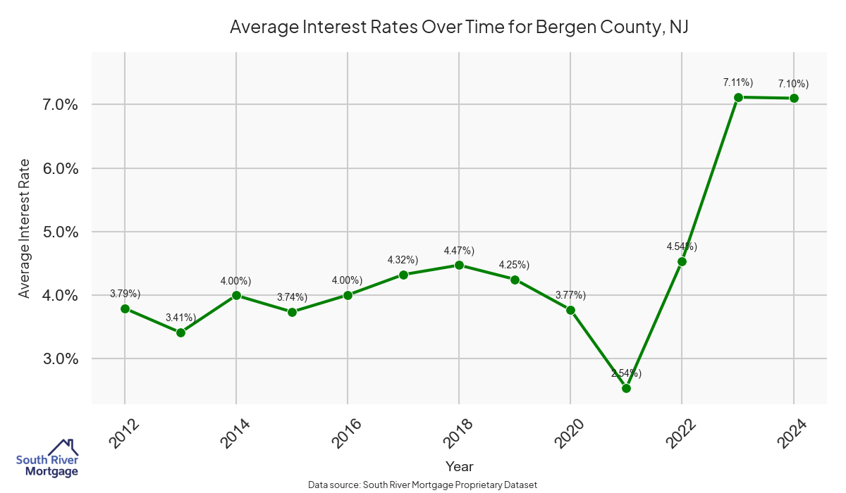 There are approximately 694 active reverse mortgage loans in Bergen County. The average interest rate in Bergen County is 7.81% for reverse mortgages. The average maximum claim amount (the lesser of the appraisal or lending limit), among reverse mortgage borrowers, in Bergen County was $625,677.97 in 2024.