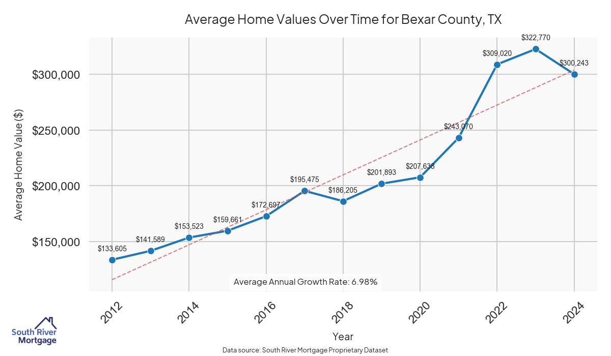 In 2024, there were 1516 active reverse mortgage loans in Bexar County, Texas. The average home value in Bexar County is $320,317.59.