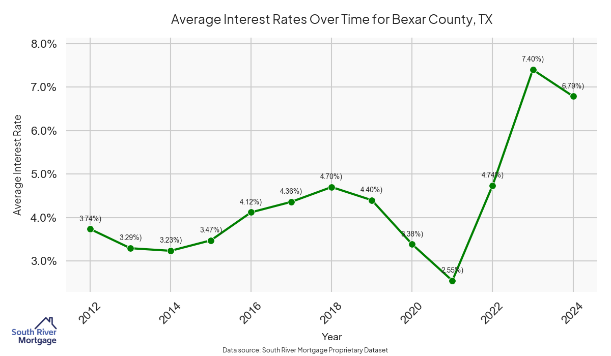 There are approximately 1516 active reverse mortgage loans in Bexar County. The average interest rate in Bexar County is 7.61% for reverse mortgages. The average maximum claim amount (the lesser of the appraisal or lending limit), among reverse mortgage borrowers, in Bexar County was $303,943.66 in 2024.