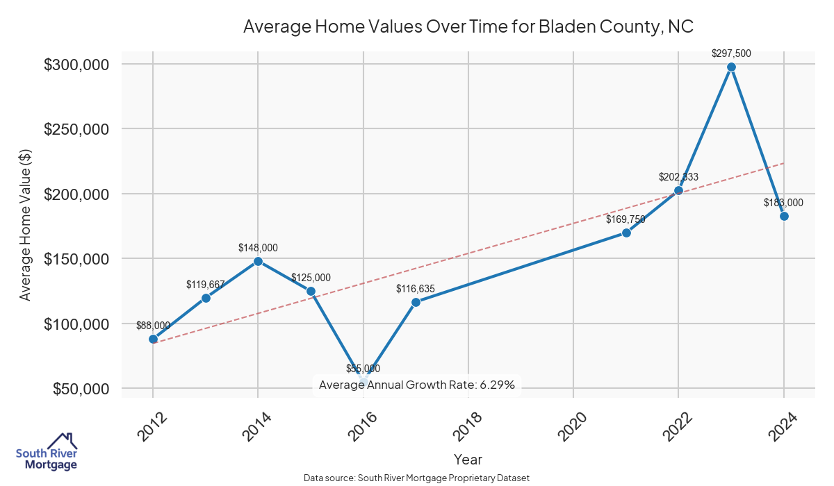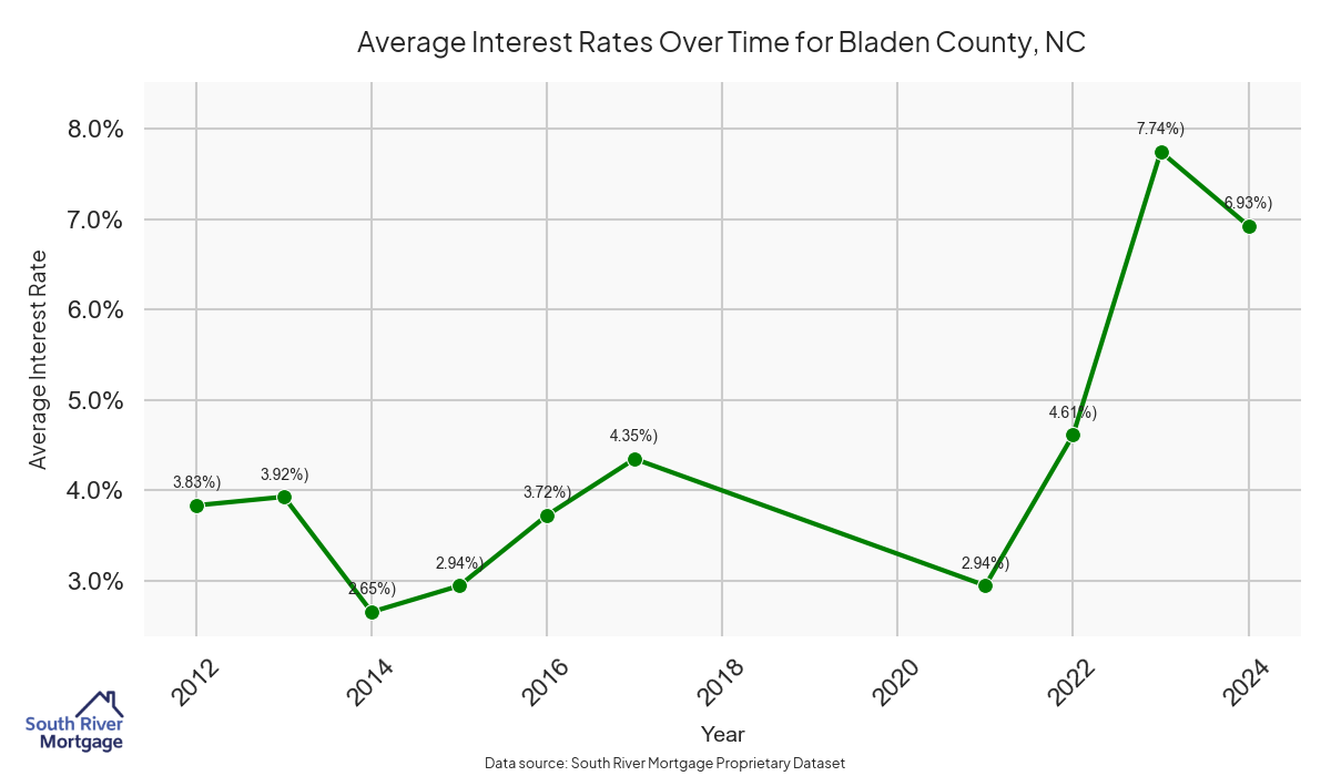 There are approximately 19 active reverse mortgage loans in Bladen County. The average interest rate in Bladen County is 7.75% for reverse mortgages. The average maximum claim amount (the lesser of the appraisal or lending limit), among reverse mortgage borrowers, in Bladen County was $300,000.00 in 2024.
