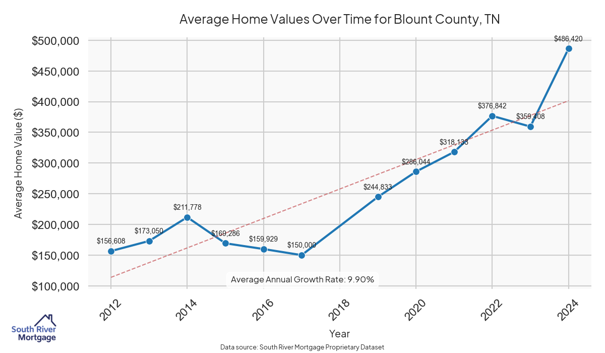 In 2024, there were 159 active reverse mortgage loans in Blount County, Tennessee. The average home value in Blount County is $431,880.89.