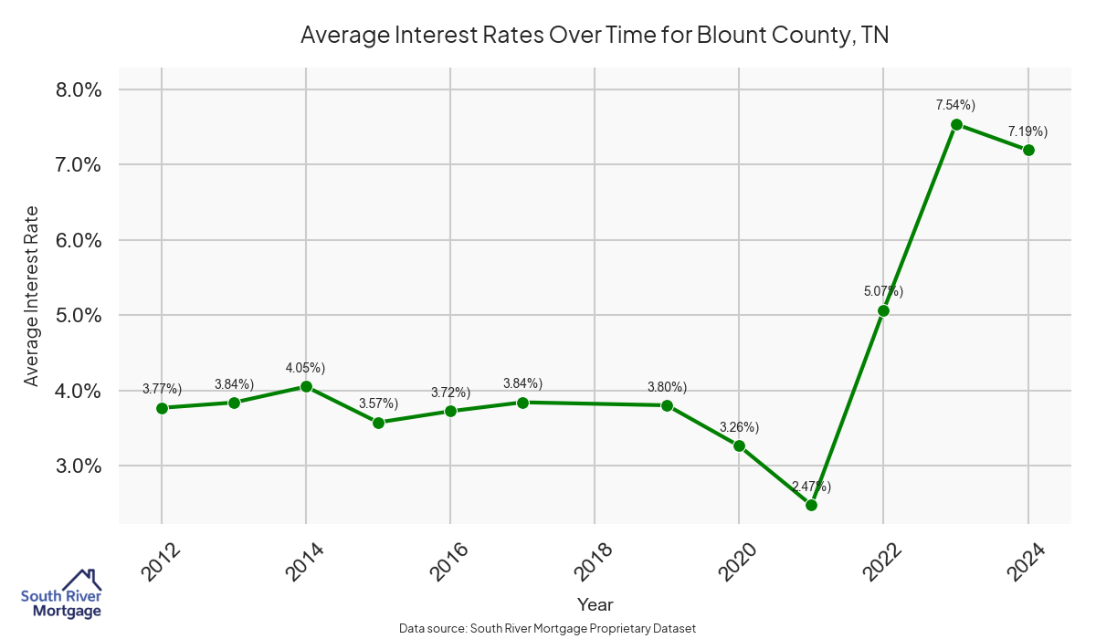 There are approximately 159 active reverse mortgage loans in Blount County. The average interest rate in Blount County is 7.58% for reverse mortgages. The average maximum claim amount (the lesser of the appraisal or lending limit), among reverse mortgage borrowers, in Blount County was $353,571.43 in 2024.
