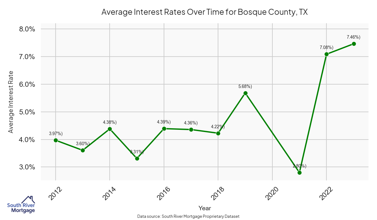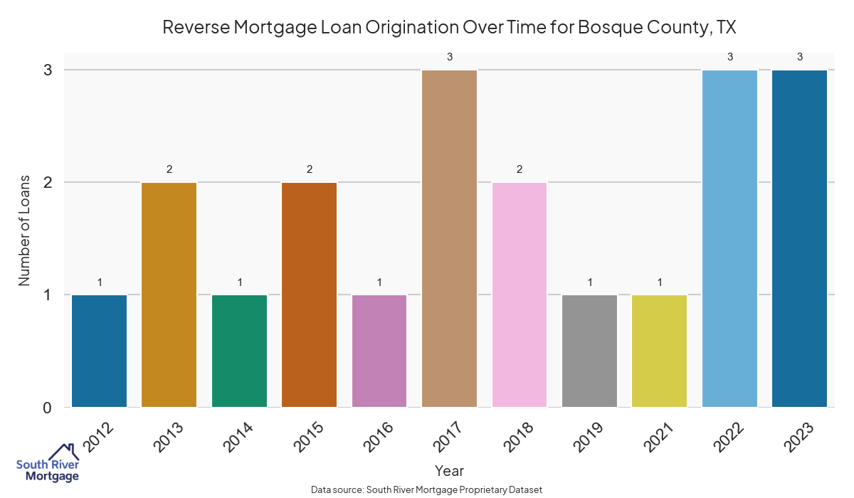 There are approximately 19 active reverse mortgage loans in Bosque County. The average interest rate in Bosque County is 7.92% for reverse mortgages. The average maximum claim amount (the lesser of the appraisal or lending limit), among reverse mortgage borrowers, in Bosque County was $555,000.00 in 2024.