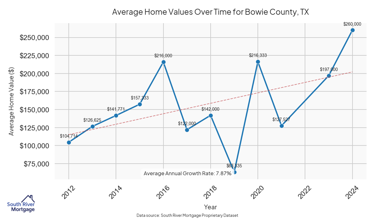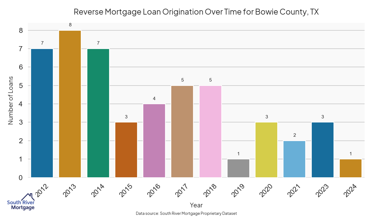 In 2024, there were 48 active reverse mortgage loans in Bowie County, Texas. The average home value in Bowie County is $228,015.40.