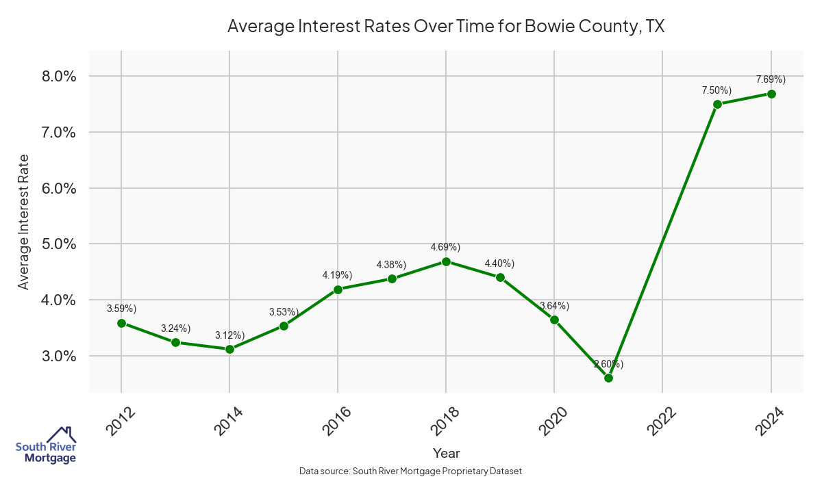 There are approximately 48 active reverse mortgage loans in Bowie County. The average interest rate in Bowie County is 7.84% for reverse mortgages. The average maximum claim amount (the lesser of the appraisal or lending limit), among reverse mortgage borrowers, in Bowie County was $160,000.00 in 2024.