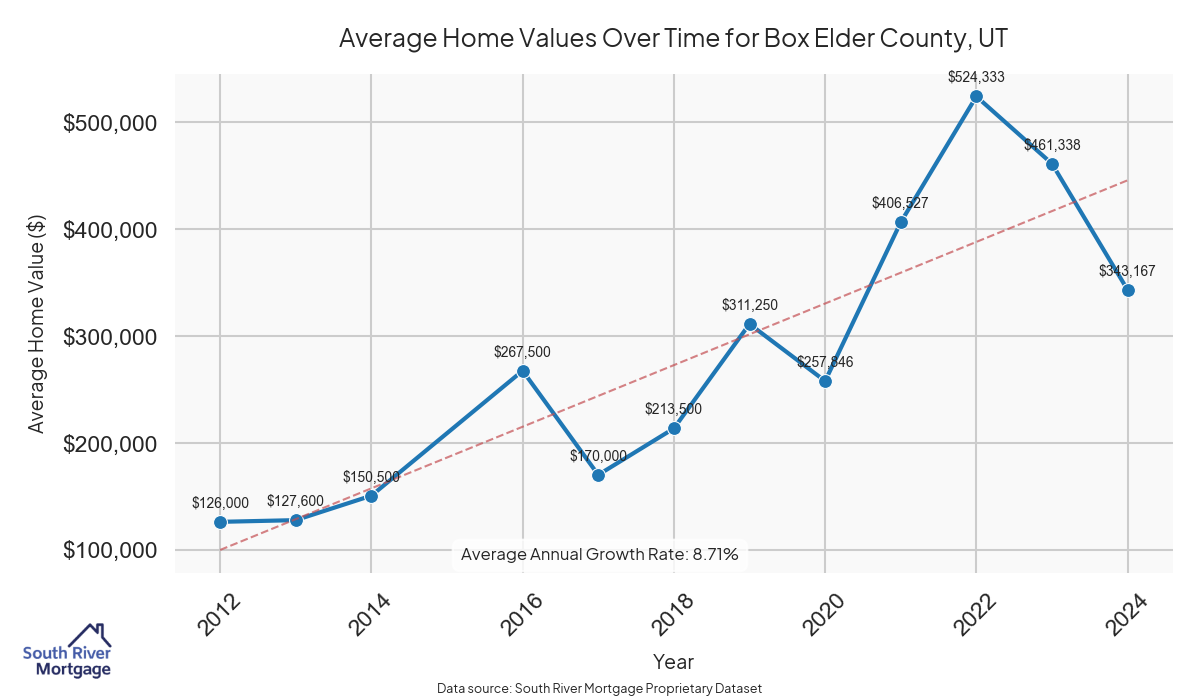 In 2024, there were 127 active reverse mortgage loans in Box Elder County, Utah. The average home value in Box Elder County is $478,473.23.