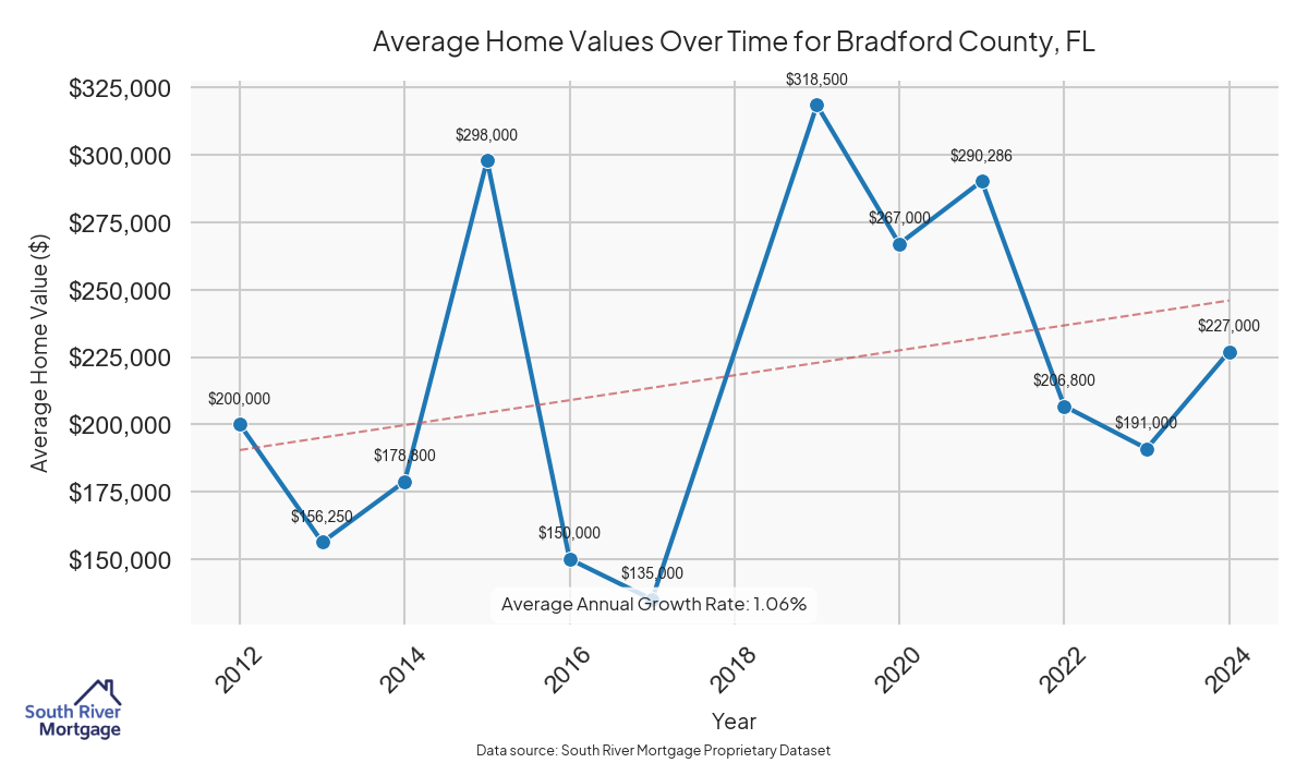 In 2024, there were 23 active reverse mortgage loans in Bradford County, Florida. The average home value in Bradford County is $290,838.26.