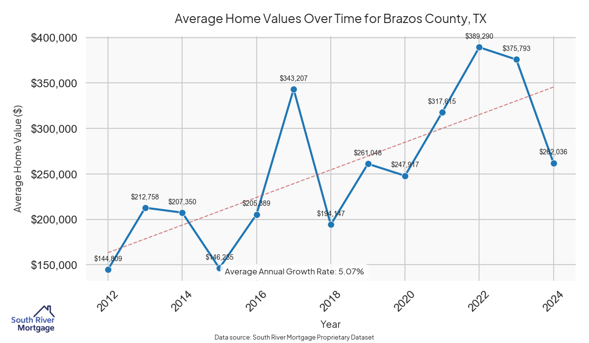 In 2024, there were 99 active reverse mortgage loans in Brazos County, Texas. The average home value in Brazos County is $405,273.51.