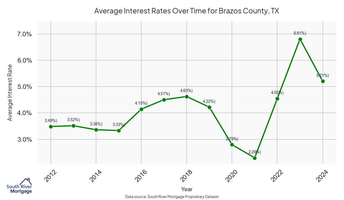 There are approximately 99 active reverse mortgage loans in Brazos County. The average interest rate in Brazos County is 7.53% for reverse mortgages. The average maximum claim amount (the lesser of the appraisal or lending limit), among reverse mortgage borrowers, in Brazos County was $335,000.00 in 2024.
