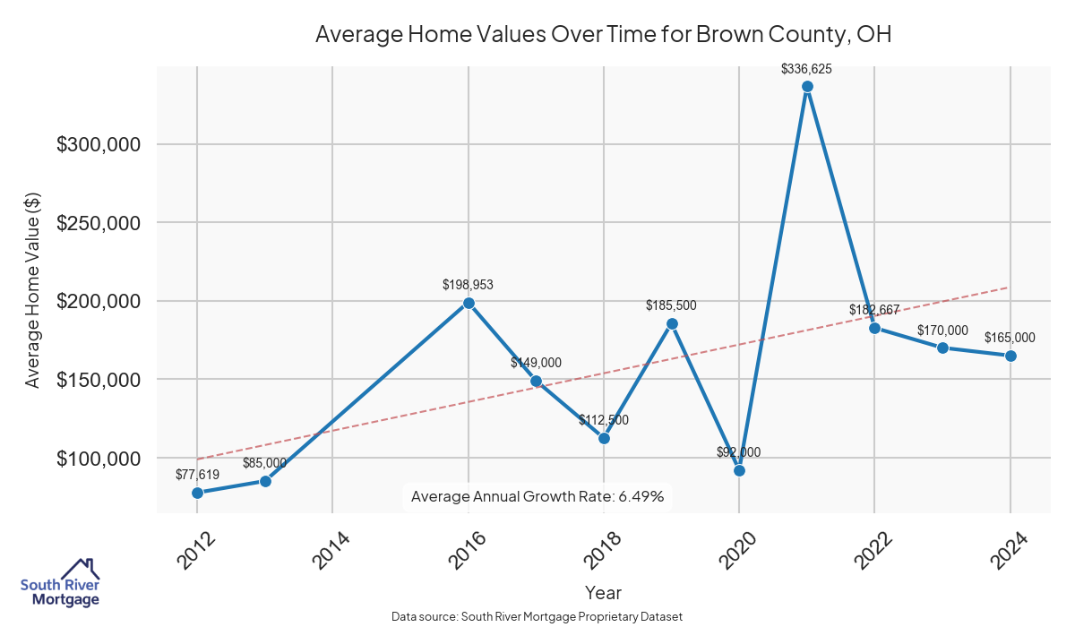 In 2024, there were 33 active reverse mortgage loans in Brown County, Ohio. The average home value in Brown County is $208,020.30.