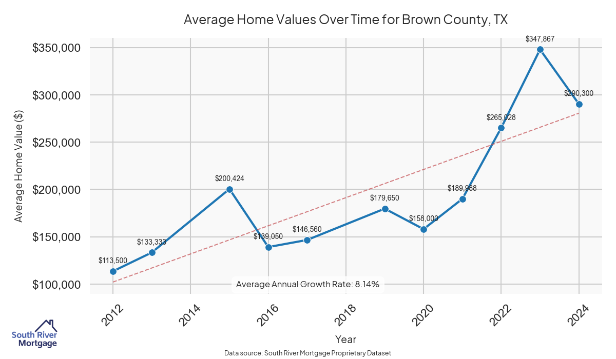 In 2024, there were 39 active reverse mortgage loans in Brown County, Texas. The average home value in Brown County is $286,181.54.