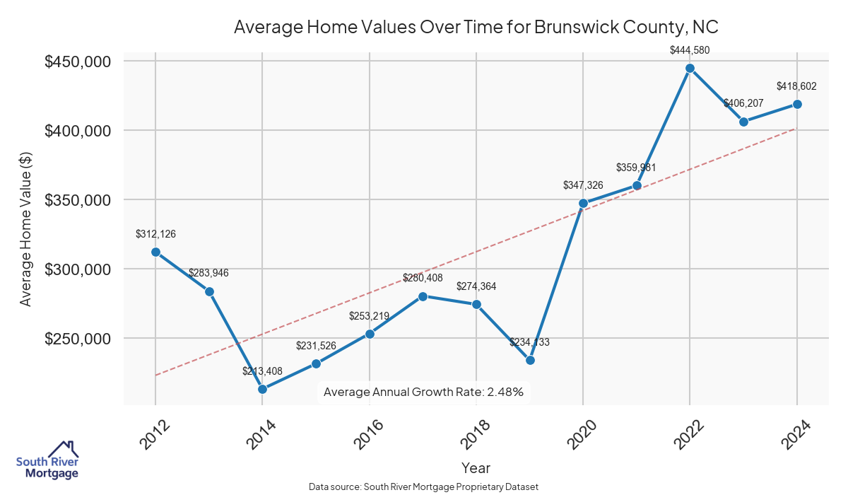 In 2024, there were 318 active reverse mortgage loans in Brunswick County, North Carolina. The average home value in Brunswick County is $493,469.64.