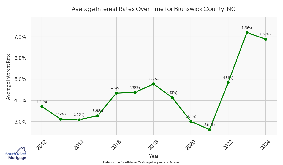 There are approximately 318 active reverse mortgage loans in Brunswick County. The average interest rate in Brunswick County is 7.44% for reverse mortgages. The average maximum claim amount (the lesser of the appraisal or lending limit), among reverse mortgage borrowers, in Brunswick County was $440,000.00 in 2024.