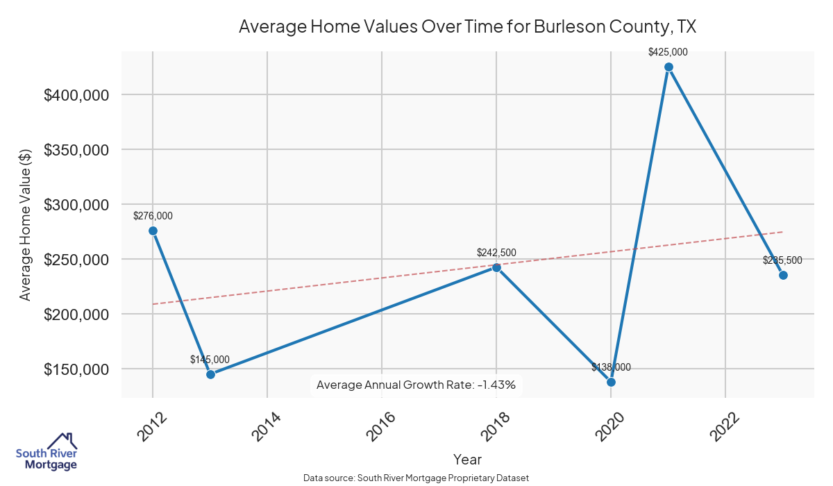 Burleson County, Texas, is a charming rural area located in the eastern part of the state. While the exact population may vary, the county is known for its peaceful countryside, agricultural heritage, and small-town charm. The county has a rich history, with notable historical sites such as the Somerville Iron Bridge, a rare example of a pin-connected Pratt through truss bridge. The average home value in Burleson County is $197,264.29, with an average property tax of $3,307.53 and an average interest rate of 4.57%. For seniors looking to leverage their homes for extra income or cash flow, a reverse mortgage could be a viable option. With the county’s steady property values and relatively low property tax rates, seniors may find reverse mortgages to be a useful financial tool to supplement their retirement income and enjoy their golden years in a place known for its serene beauty and historical significance.