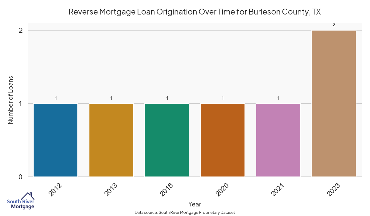 There are approximately 7 active reverse mortgage loans in Burleson County. The average interest rate in Burleson County is 8.21% for reverse mortgages. The average maximum claim amount (the lesser of the appraisal or lending limit), among reverse mortgage borrowers, in Burleson County was $295,000.00 in 2024.
