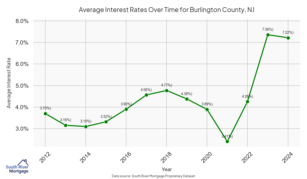 There are approximately 510 active reverse mortgage loans in Burlington County. The average interest rate in Burlington County is 7.66% for reverse mortgages. The average maximum claim amount (the lesser of the appraisal or lending limit), among reverse mortgage borrowers, in Burlington County was $322,115.38 in 2024.