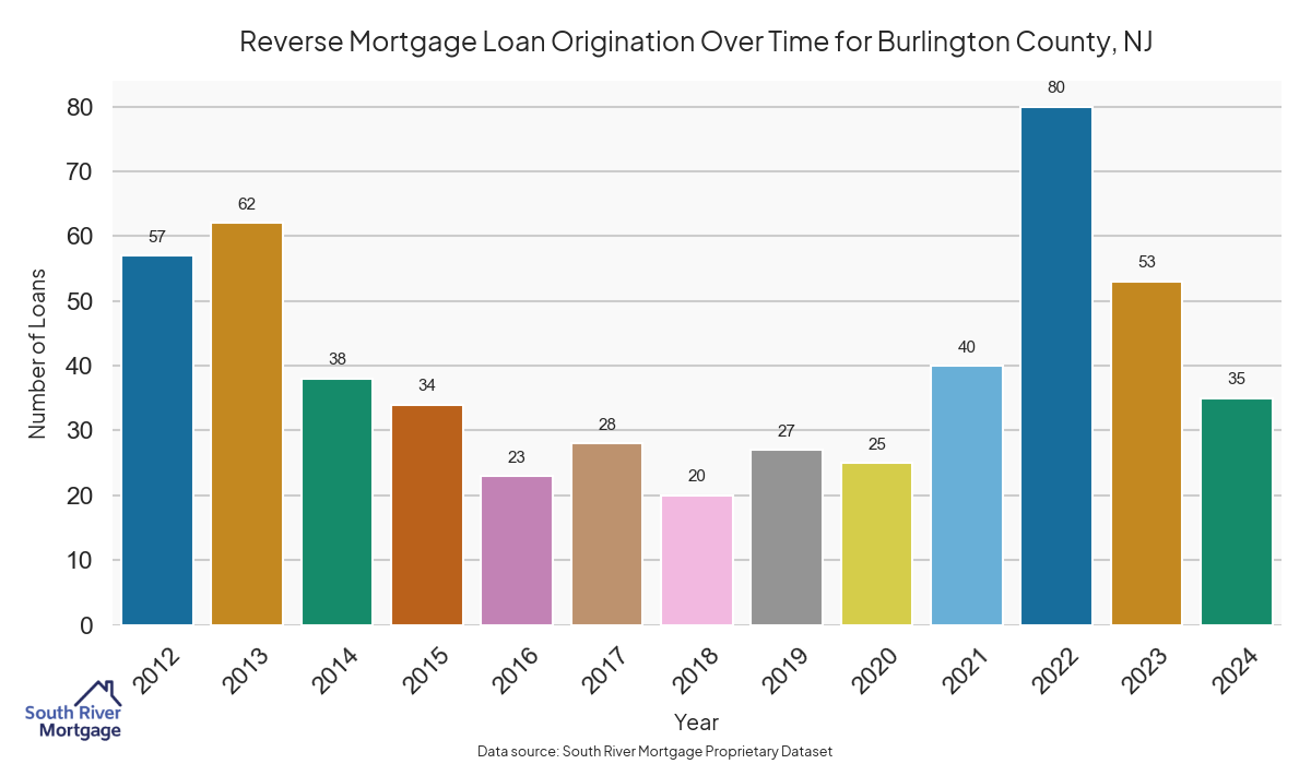 In 2024, there were 510 active reverse mortgage loans in Burlington County, New Jersey. The average home value in Burlington County is $422,524.18.