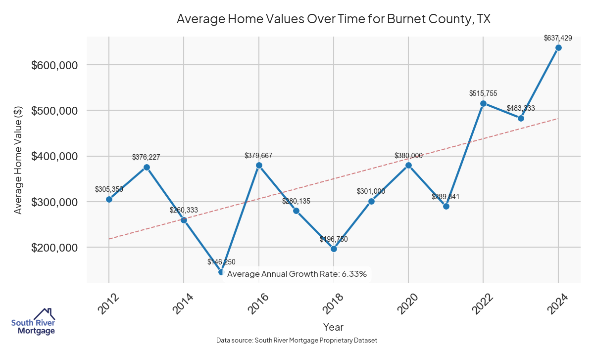 In 2024, there were 82 active reverse mortgage loans in Burnet County, Texas. The average home value in Burnet County is $586,647.66.