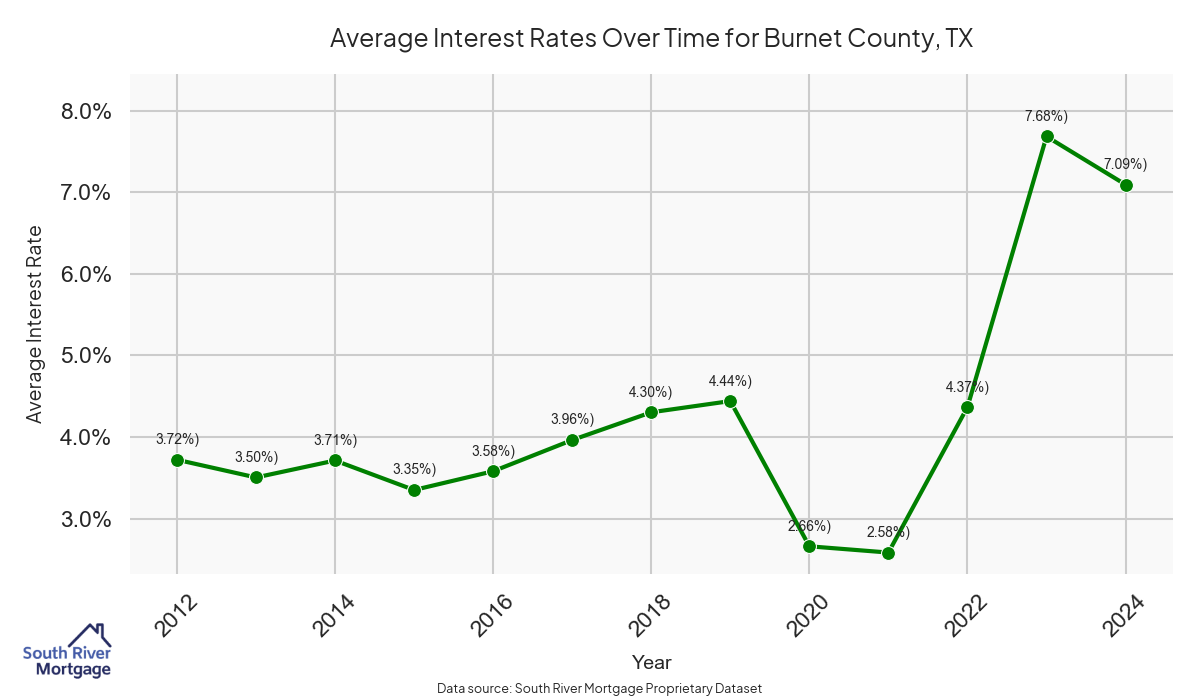 There are approximately 82 active reverse mortgage loans in Burnet County. The average interest rate in Burnet County is 7.36% for reverse mortgages. The average maximum claim amount (the lesser of the appraisal or lending limit), among reverse mortgage borrowers, in Burnet County was $455,000.00 in 2024.