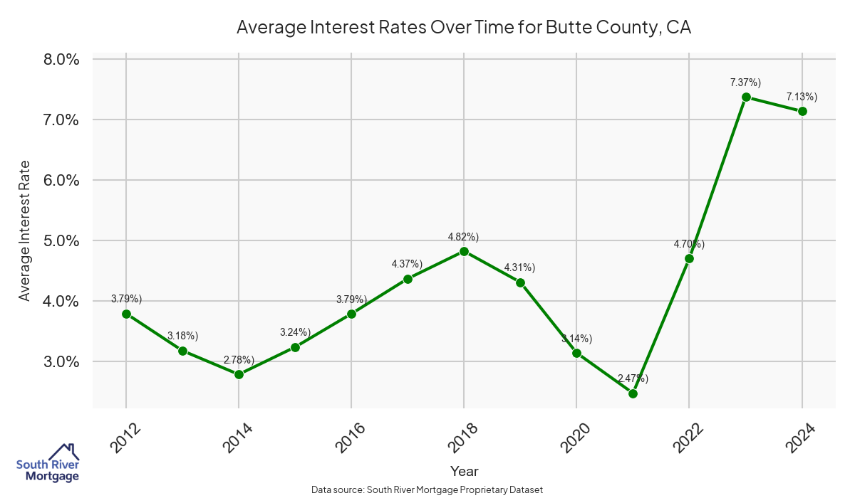 There are approximately 325 active reverse mortgage loans in Butte County. The average interest rate in Butte County is 7.16% for reverse mortgages. The average maximum claim amount (the lesser of the appraisal or lending limit), among reverse mortgage borrowers, in Butte County was $439,516.13 in 2024.