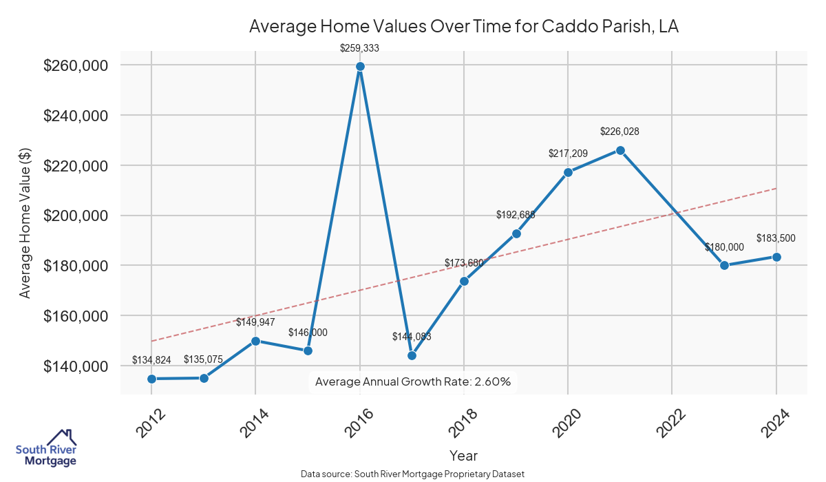 In 2024, there were 146 active reverse mortgage loans in Caddo Parish, Louisiana. The average home value in Caddo Parish is $189,745.90.