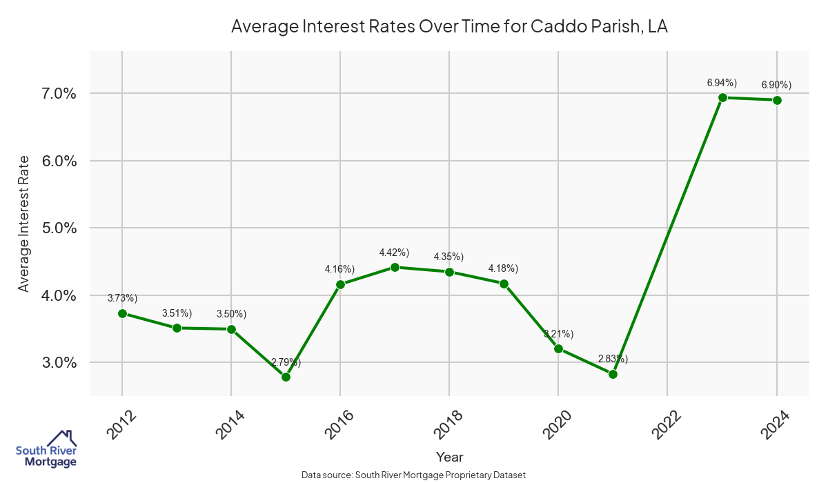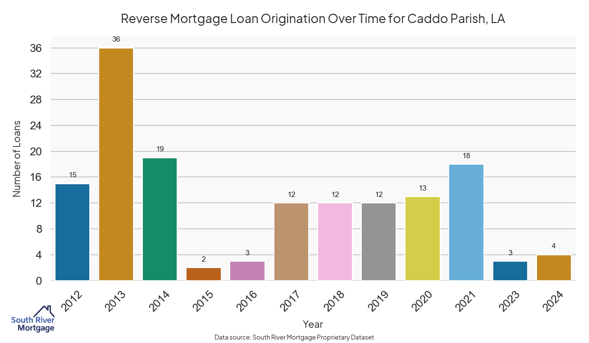 There are approximately 146 active reverse mortgage loans in Caddo Parish. The average interest rate in Caddo Parish is 7.37% for reverse mortgages. The average maximum claim amount (the lesser of the appraisal or lending limit), among reverse mortgage borrowers, in Caddo Parish was $231,363.64 in 2024.
