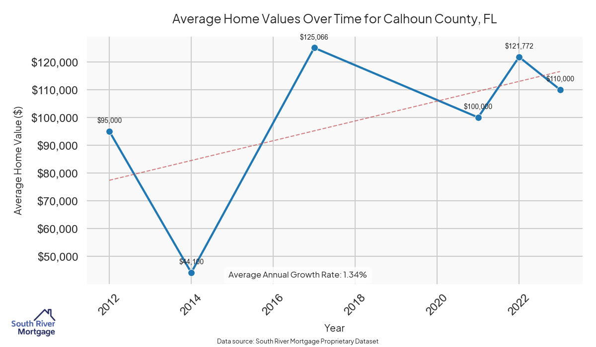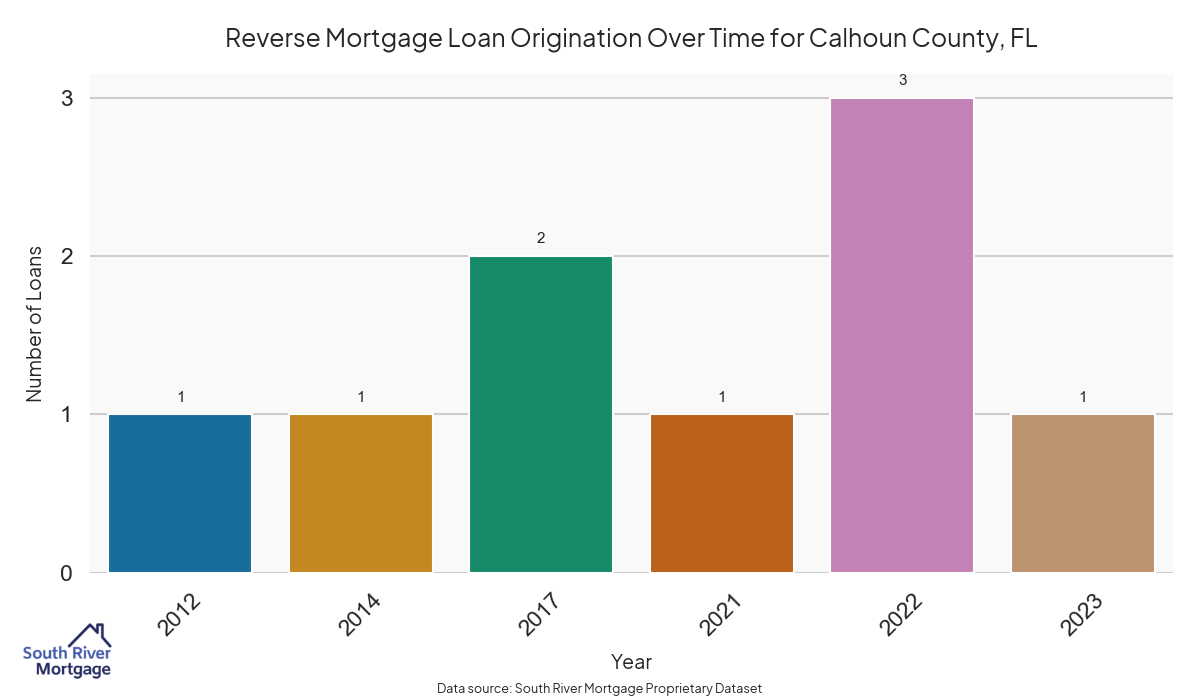 In 2024, there were 8 active reverse mortgage loans in Calhoun County, Florida. The average home value in Calhoun County is $122,107.13.